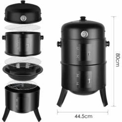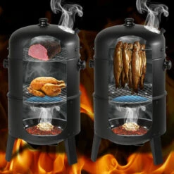 - 【Grande capacité】Fumoir à Charbon de Bois Vertical de 16 Pouces. Grâce aux 3 chambres, 2 grilles en acier de 37cm de diamètre, et 1 maille de carbone de 25 cm, vous pouvez cuire les viandes, poissons, légumes, fruits et saucisses sans aucun soucis.