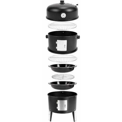 Ce barbecue offre une multitude de possibilités en terme de cuissons et de plats. Il s’utilise en tant que barbecue traditionnel ou fumoir, c’est à vous de voir. Il est composé d’un capot, d’un compartiment de fumage avec porte et d’une cuve à charbon également avec portes. Ces deux portes permettent de rajouter du liquide de fumage et du copeau de bois. Ces deux éléments sont primordiaux car ce sont eux qui apporteront le goût de fumage à votre viande ou poisson. Le charbon de bois peut être au goût de hêtre, de pomme, de clous de girofle… les possibilités sont infinies. Quant au liquide de fumage, il se place dans la coupelle située juste au-dessus de la zone de chaleur (la cuve à charbon), et vous pouvez y mettre de l’eau pour une saveur neutre, ou encore du vin, vinaigre, bouillon… c’est ce qui permet d’obtenir une chaleur humide et une cuisson uniforme, tendre. Si vous souhaitez utiliser le barbecue comme un gril, n’utilisez pas de liquide et la chaleur sera directement en contact avec la nourriture.
