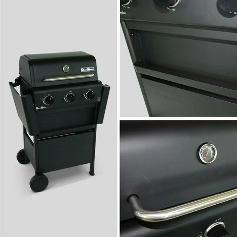 Ce barbecue au design linéaire est un produit de qualité. Pour plus de longévité, sa structure et en acier recouvert de peinture époxy et ses 3 brûleurs sont en acier inoxydable et résistants à la corrosion. Les poignées sont aussi en acier inoxydable. Ce barbecue est pratique, il a un allumage électronique par piezo. Les 3 brûleurs sont indépendants, il est donc possible de cuire des aliments à des puissances différentes. Ce barbecue est livré avec 3 grilles, 2 grilles de cuisson en acier émaillé et une grille qui garde au chaud les aliments. Vous pourrez contrôler la cuisson des aliments à l’aide du thermomètre. Le barbecue Bonacieux est facile à déplacer grâce à ses deux roues. Pratique, il est équipé de 2 tablettes latérales pour ranger vos plats. Pour un gain de place optimal, elles sont rabattables. Le barbecue est facile à nettoyer grâce à son bac récupérateur de graisse amovible. L’armoire en façade est pratique pour ranger condiments et ustensiles.