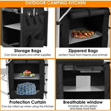 - Grand Espace de Stockage : La taille du produit de la cuisine de camping est de 122 x 54 x 117 cm. Avec de nombreuses étagères et compartiments de rangement, il y a amplement d’espace pour un grand nombre d’ustensiles de cuisine et d’ingrédients. La capacité de charge de chaque couche est d’environ 15 kg.