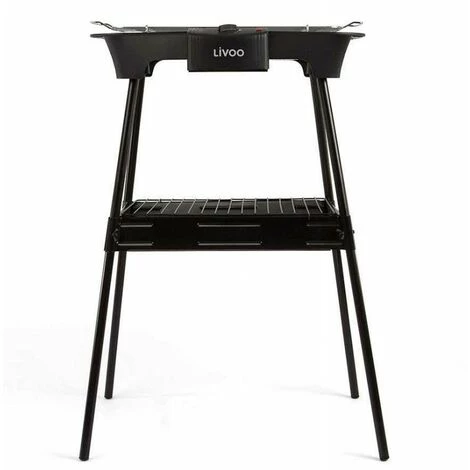 Barbecue électrique sur pieds Livoo DOC204. Entièrement démontable pour un entretien et un transport facile. Peut être utilisé comme barbecue de table. Pare vent amovible et grille de maintien au chaud.
