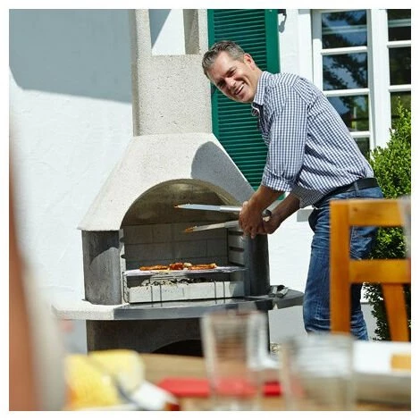 La cheminée d’extérieur en béton armé Buschbeck® permet d’agrémenter votre jardin d’un beau barbecue extérieur. L’association du blanc de la cheminée assorti au coloris anthracite du corps rehaussé par la margelle en acier Inoxidable font de ce grill le nouveau point d’attention de votre jardin. Les barbecues Buschbeck® offre une sécurité accrue grâce à la fabrication exclusive de double parois permettant de garder la surface extérieure froide. L’air circule constamment entre la paroi extérieure (habillage) et le foyer de cuisson, évitant le risque de brûlures par contact sur les parties extérieures. Vous pouvez utiliser du charbon de bois et/ou du bois dans ce barbecue. Vous trouvez une niche sous le plan de travail pour le ranger. Petite astuce : Nous vous conseillons d’utiliser du bois comme combustible car il génère une plus grande chaleur que le charbon de bois. Comprend : – Une grille de cuisson 54 x 34 x cm – Du ciment pour l’assemblage – Une notice d’utilisation Dimensions : l x H x L : 100 x 65 x 197 cm. Poids : 440 kg Surface extérieure traitée au Quartz. Ne nécessite pas d’être plâtré ou peint. Très facile a assembler. Finition blanc/anthracite. Margelle en acier inoxydable. Garantie 2 ans LIVRAISON SOUS 10 JOURS OUVRES
