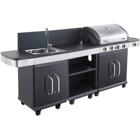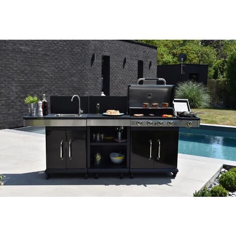 Si vous cherchez des alliés pour cuisiner vos plats de façon rapide et pratique en extérieur, c’est l’ensemble barbecue FIDGI 4 + desserte + évier qu’il vous faut ! Le barbecue au gaz est composé d’une partie « grille » et d’une autre « plancha » pour vous permettre de cuire simultanément vos viandes, légumes ou poissons. Mais ce n’est pas tout : il dispose aussi d’un réchaud latéral pour maintenir vos plats à température et de 4 brûleurs, équipés d’un allumage par piezo intégré pour une puissance de 14,5Kw. Enfin, il possède également un capot avec thermomètre intégré, 4 roues multidirectionnelles et un caisse double porte pour ranger votre bouteille de gaz ou vos accessoires.La desserte, elle, satisfera tout vos besoins grâce à sa grande surface de travail, ses rangements et ses roues multidirectionnelles équipées de freins.Quant à l’évier, il vous sera d’une grande aide pour laver vos aliments, vos plats ou vos mains, pendant que vous préparerez vos repas dehors.Après avoir fixé ces deux modules à votre barbecue, vous pourrez profiter d’une véritable cuisine d’extérieur, capable de recevoir jusqu’à 10 convives !