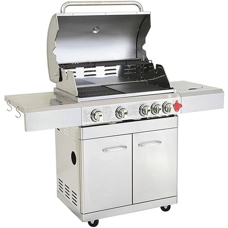 4 BRĂLEURS+1 FEU LATĂRAL : Avec une puissance totale de 14KW (soit 3,5KWpar brĂ»leur) par lâaddition des 4 brĂ»leurs principaux, vous allez bĂ©nĂ©ficier dâun vĂ©ritable appareil de cuisson. Chaque brĂ»leur est conçu en acier inox afin quâils puissent perdurer dans le temps et quâils continuent Ă fournir la mĂȘme intensitĂ© de chauffe Ă chaque utilisation de lâappareil et cela malgrĂ© les annĂ©es. Vous pouvez retrouver en façade les cinq boutons correspondant aux quatre brĂ»leurs principaux et au brĂ»leur complĂ©mentaire.
