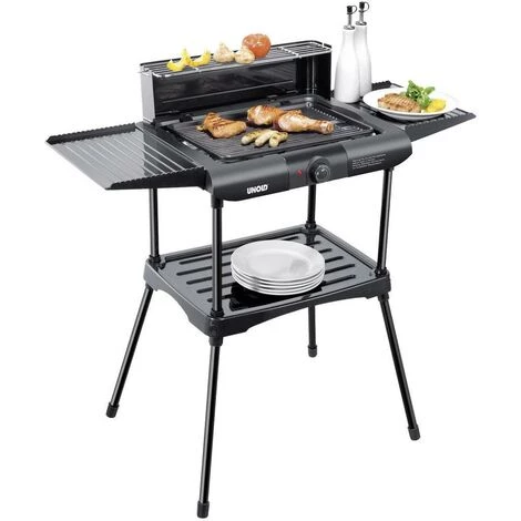 Des grillades saines sans charbon de bois Barbecue électrique de qualité avec fonction grill Finies les difficultés d’allumage, la fumée qui pique aux yeux, les dépôts nocifs pour la santé sur la viande, et les voisins en colère ! Le barbecue-grill Vario UNOLD est prêt à fonctionner à tout moment, il suffit de le brancher sur une prise électrique. Sa puissance est de 1.600 watts. Grâce à sa surface de cuisson réglable en hauteur, il viendra à bout de tous les steaks et saucisses ! L’élément chauffant est couvert pour éviter que la graisse ne coule dessus. La température est réglable en continu et la grille anti-adhésive en aluminium empêche les aliments de brûler. Les plateaux situés sur les côtés permettent de déposer des assiettes, des couverts ou des accompagnements (sauces, aromates, moutarde…). Grâce à la protection contre le vent, il est possible d’utiliser cet appareil même par temps venteux. Une fois le repas terminé, il peut être démonté et rangé facilement. Ce grill peut également être utilisé sur une table, sans les pieds.