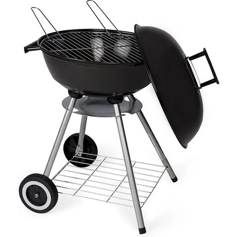 Barbecue rond au charbon de bois avec thermomètre et grille de ventilation dans le couvercle de la marque BBQ Collection dispose de 2 roues, d’une grille de rangement et d’un bac de récupération des cendres.