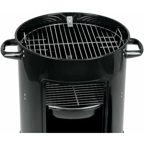 Grâce au bac à eau intégré, la température est mieux équilibrée et les aliments sont plus juteux. La grande porte à l´avant est idéale pour ajouter du charbon de bois, des briquettes ou des chips de fumage.