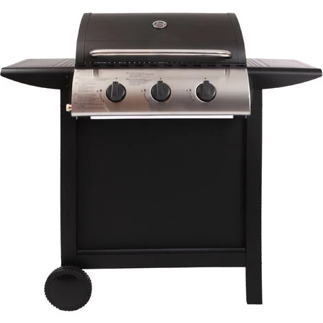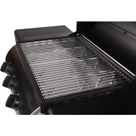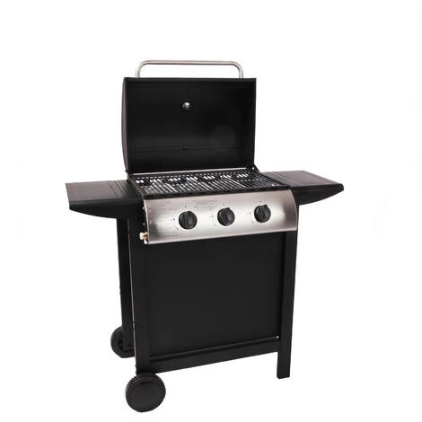 Facile à utiliser, il possède 3 brûleurs et une grande surface de cuisson avec deux grilles en acier chromé. Capot équipé d’un thermomètre, pratique pour contrôler la cuisson quand il est fermé. Chariot doté de deux étagères latérales et d’un plateau inférieur pour placer assiettes et aliments. Léger et facile à déplacer grâce à ses deux roues. Outre sa simplicité d’utilisation, il est chic et élégant avec sa jupe noire qui permet de dissimuler la bouteille de gaz. Enfin, ce barbecue est conçu pour une utilisation en extérieur. Sa structure métallique est robuste. Ses brûleurs en acier inoxydable sont résistants à la corrosion. Facile à nettoyer : laissez votre barbecue à pleine puissance pendant quelques minutes. Les résidus alimentaires sont brûlés et éliminés facilement.