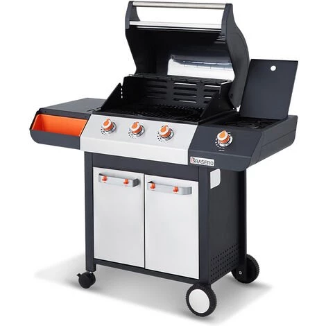 Nombreuses fonctionnalités :Ce système dispose d’une grille ronde interchangeable pou r plus de flexibilité. Ce Barbecue dispose également de 4 roulettes dont 2 autobloquantes, 3 brûleurs, 2 tablettes dont 1 brûleur latéral, d’un récupérateur de graisse, d’un thermomètre, 1 grille de réchauffement, 4 crochets pour les ustensiles, 1 panier de rangement. Jusqu’à 10 convives.