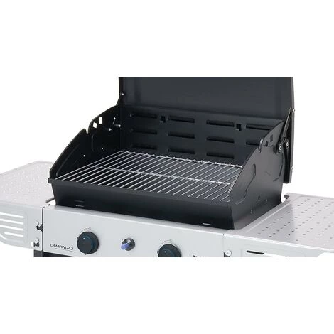 Puissance : 7.100 W – Surface de cuisson : 1.535 cm2 – 2 br�leurs en acier aluminis� – Allumage pi�zo�lectrique – Grille chrom�e – 2 tables lat�rales rabattables avec crochets pour suspendre les accessoires de cuisson – Dessus en acier estamp� – 2 roues – Ecran frontal en tissu