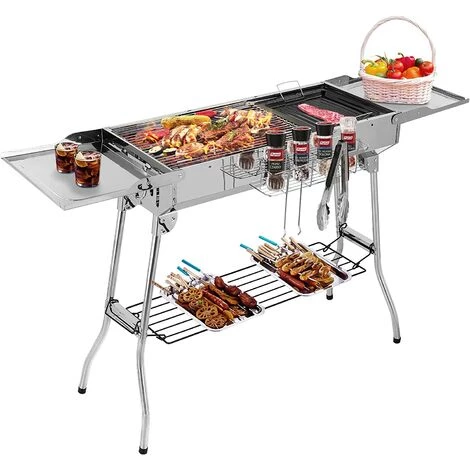 Femor Barbecue à Charbon Pliant Portable, BBQ De Table Avec Double Ailes, Pour Camping Et Pique Nique, Barbecue De Jardin, Avec Poêle à Frire Antiadhésive, 122*30*75cm