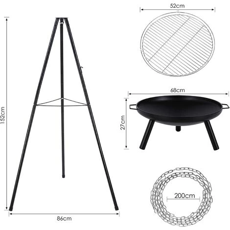 Accessoires Complets – Contenu de la livraison: 1 bol à feu (Ø60cm), 1 grille de gril (Ø52cm), 1 trépied (H: 152 cm) et 1 chaîne réglable en hauteur (200 cm). Les accessoires sont complets et peuvent être utilisés immédiatement.
