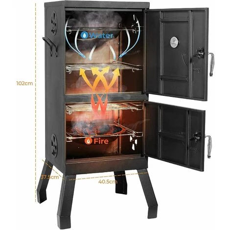 ★ Informations détaillées: Le fumeur a une grande capacité, 102 cm de haut, 40.5 cm de long, 37.5 cm de large, 2 grilles de gril, avec 1 bol d’eau et bol à charbon, la position de la grille à 4 couches peut être modifiée selon les besoins. Faites cuire plusieurs aliments en même temps.
