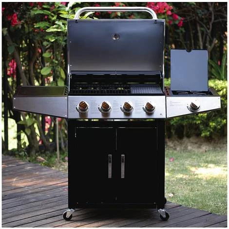 Parfait pour vos réceptDescriptif : Ce modèle est équipé dune tétine gaz. : Vous avez besoin dun tuyau de gaz et dun détendeur conforme, selon votre type de bouteille et de gaz. Ne pas raccorder sur le gaz naturel de ville. Respecter la date de validité inscrite sur le flexible . Surface de cuisson : 63.5 cm x 40.6 cm. Puissance : De 15 à 20 kW. Nombre de brûleur : 5. Grille de cuisson : 2 grilles en acier – 1 plaque de cuisson en acier + Réchaud. Couvercle : Double couche d’acier inoxydable – Jauge de température. Système d’allumage : Allumage électronique. Chariot : En acier avec poignée. Dimensions : 135.7 x 53.4 x 111.4 cm – Cabinet : L61 x P36 x H55 cm. Plus produit : Placard de rangement 2 portes – 4 roues directionnelles – Boutons de contrôle en inox – Structure solide – Design soigné – Jauge de température – Récupérateur de graisse. Colisage : 1 colis : – 0,74 x 0,57 x 0,635 m, 36 kg.