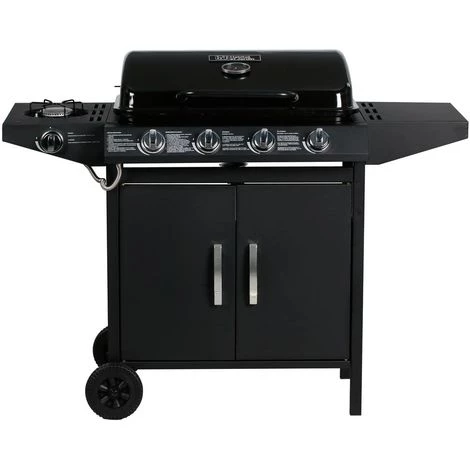 Barbecue gaz 5 brûleurs : 4 brûleurs 9.6 kW + 1 brûleur latéral 3.3kW – Surface de cuisson : 64 x 37 cm – Structure en acier – Grilles acier émaillé – Plaque cuisson fonte – Bac récupérateur de graisse amovible – 2 roues de déplacement – Tuyau et détendeur non fournisLe barbecue au gaz Très pratique, nos barbecues sont dotés d’un allumage électronique qui vous permet de mettre en marche ses brûleurs rapidement. Facile à manipuler, il vous suffira de tourner l’un des boutons pour actionner le mécanisme. Des brûleurs en inox vous assurent une qualité de cuisson optimale ! Résistants à la corrosion, les brûleurs de ce barbecue proposent une cuisson homogène et rapide.