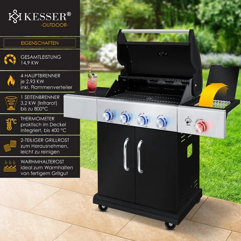 Barbecue KESSER Chariot à barbecue à gaz Master, en acier inoxydable de haute qualité, 5 éléments de commande réglables en continu avec éclairage LED, 4 brûleurs principaux et 1 brûleur latéral avec thermomètre intégré ainsi que des portes et un couvercle à double paroi en acier inoxydable brossé