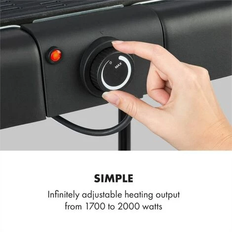 Ce grill électrique de 1700 à 2000 watts dispose d’un élément chauffant librement réglable, disposé sur un support amovible doté de quatre pieds robustes. Il est parfaitement adapté aux grillades en plein air. Afin d’éviter que les aliments ne brûlent et de faciliter le nettoyage du grill électrique Dr. Beef Pro, les grilles de cuisson sont fabriquées en aluminium coulé sous pression avec un revêtement antidérapant de haute qualité. La graisse s’écoule à travers les orifices situés sur la surface de cuisson dans un réservoir situé en-dessous, pouvant être éventuellement rempli d’eau. Cela empêche la graisse de bruler et offre une protection supplémentaire pour l’élément chauffant en inox 201 contre la chaleur. Après la cuisson, le réservoir peut être simplement vidé et facilement lavé. Il est également adapté au lave-vaisselle. Les aliments cuits peuvent être conservés sur la grande grille qui garde chaud de 47 x 8 cm sans qu’ils ne brûlent ou ne refroidissent. Pour encore plus de confort lors de la grillade, le grill est doté de deux tables d’appoint latérales pratiques avec des dimensions de 20 x 31 cm. Vous pourrez y placer des épices, sauces, aliments, ustensiles de barbecue et boissons. Vous disposez d’encore plus de place grâce à un espace de rangement de 51 x 35 cm intégré dans la structure du grill, où vous pourrez, par exemple, stocker des boissons ou des aliments.