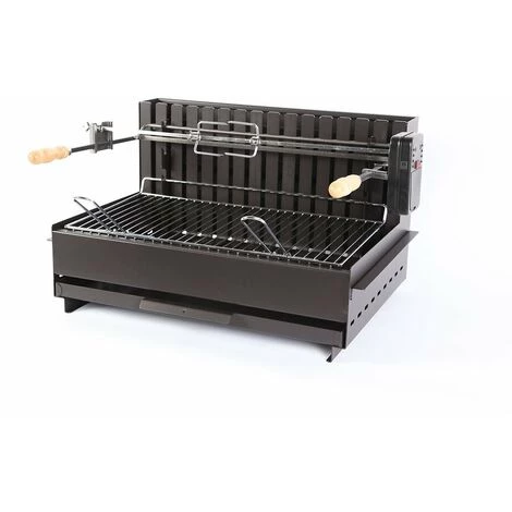 – Un foyer vertical avec un tournebroche, un moteur à piles force 12kg et une broche à lardoires