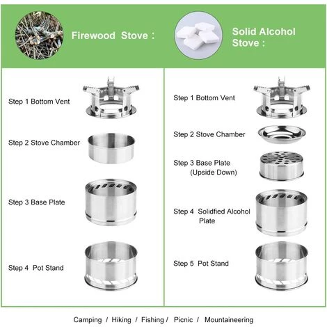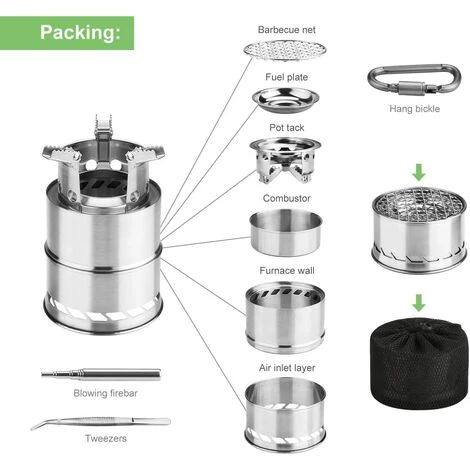 [Réchaud de camping robuste] Ce réchaud à dos adopte un système de support à trois bras, qui peut fournir une plate-forme de cuisson sûre et stable et répartir uniformément la chaleur.[Carburant gratuit illimité] Utilisez des branches, des feuilles, des branches et du bois comme combustible pour préparer un repas pendant la randonnée, pas besoin de dépenser de l’argent pour des réservoirs de carburant, et pas d’émissions chimiques et d’empreinte carbone. Le réchaud comprend un plateau pour contenir de l’alcool solide.[Grille de barbecue attachée] Cette grille de camping est équipée d’une grille, donc peu importe où vous installez un camping, vous pouvez commencer à griller. Convient pour le camping, la randonnée, la randonnée, le pique-nique, le barbecue, la survie en plein air et l’aventure.[Pliable et léger] Il peut être facilement plié dans une taille compacte (5,4 « x 2,8 ») et mis dans un sac à main en filet pour un rangement pratique.[Qu’est-ce que vous obtenez] 1 x réchaud de camping en bois, 1 x tuyau de pulvérisation pliable, 1 x pince à épiler, 1 x bol d’alcool, 1 x mousqueton, 1 x barbecue