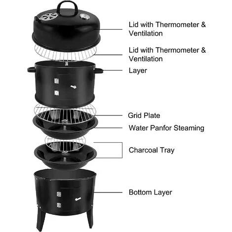 Emportez le fumoir à charbon de bois Qdreclod chez vous et profitez des barbecues en plein air avec votre famille, à tout moment et en tout lieu ! Dégustez des aliments tendres et savoureux dans votre propre jardin avec le fumoir vertical au charbon de bois Qdreclod. Il est conçu pour vous offrir une expérience inoubliable de fumage et de grillade. Grâce aux volets d’air réglables et à la conception à plusieurs niveaux, vous pouvez facilement choisir le meilleur type de barbecue en fonction de vos préférences. Il est très facile à démonter en 3 parties et à ranger dans le coffre de votre voiture pour le camping, la plage, le pique-nique, le barbecue en bord de mer, le jardin et d’autres lieux extérieurs. Vous allez l’adorer ! – Différentes façons de fumer, il peut être utilisé pour le fumage à chaud au charbon de bois ou le fumage à froid aux granulés de bois avec un tube de fumage de granulés. Il offre une grande flexibilité pour fumer | griller | cuire à la vapeur | cuire au four | braiser | rôtir sur le fumoir. – L’acier peint, le revêtement résistant aux hautes températures et les pieds très solides le rendent plus stable et durable pour une utilisation quotidienne. – Des portes d’accès fonctionnelles vous permettent de vérifier les aliments sur les grilles du gril ou d’ajouter du charbon de bois dans le bol à feu. – Les poignées durables et résistantes à la chaleur facilitent le transport, le déglaçage et la cuisson. – Grilles de cuisson chromées pour les grosses côtes, la viande, le poulet, la dinde, la pizza, la saucisse, le fromage et autres aliments. – Les évents réglables et le bac à eau en porcelaine émaillée équilibrent la fumée et l’humidité, donnant à votre viande un arôme fumé.