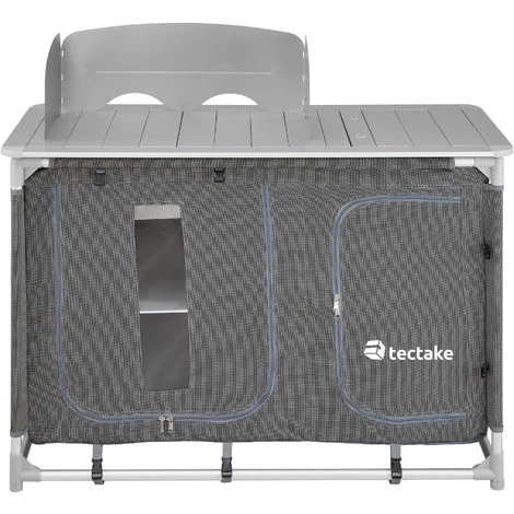 Voici le matériel de camping pratique qu’il vous faut : une cuisine de camping tectake ! Cette cuisine possède un plan de travail avec une protection pratique contre le vent et un évier amovible. Pour une bonne aération, les deux grands compartiments de rangement sont en partie recouverts d’un tissu maillé au dos. La structure robuste en aluminium et les pieds réglables en hauteur rendent ce meuble de camping très stable. Démontée, cette cuisine d’extérieur légère se transporte facilement dans le sac de transport fourni. Optez pour cette cuisine de camping fonctionnelle qui vous accompagne dans tous vos voyages, au camping, en randonnée, en excursion, au camp ou au bivouac.