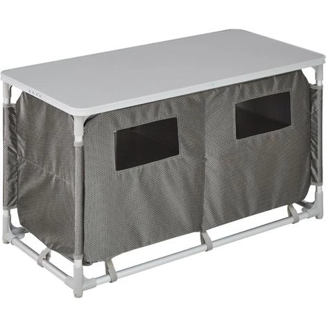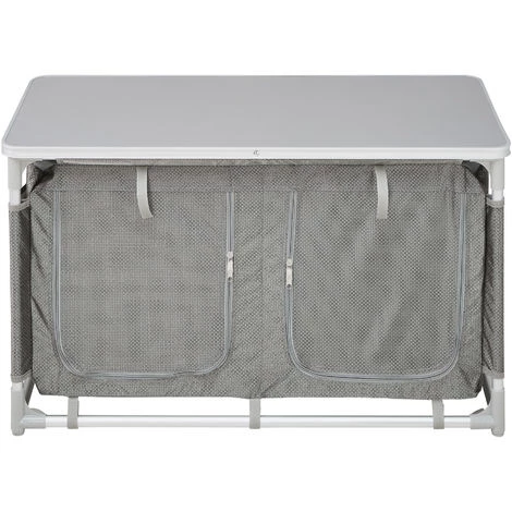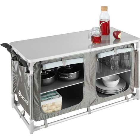 Notre meuble de camping tectake vous accompagne au camping, en excursion, au camp, au bivouac, après de longues randonnées ou même au jardin. Le plande travail spacieux et les quatre compartiments de rangement à plateaux intérieurs renforcés en aluminium et composé d’un tissu maillé aéré offrent beaucoup de place pour ranger vos ustensiles de cuisine et vos courses. Les petits objets comme les couverts peuvent se ranger dans la poche extérieure composée de trois espaces. Grâce aux quatre pieds réglables en hauteur, les irrégularités du sol ne représentent pas un problème et vous pouvez installer ce meuble de camping où vous le désirez. Facile à monter et compacte une fois démontée, la cuisine de camping convient parfaitement pour toutes les utilisations en extérieur.